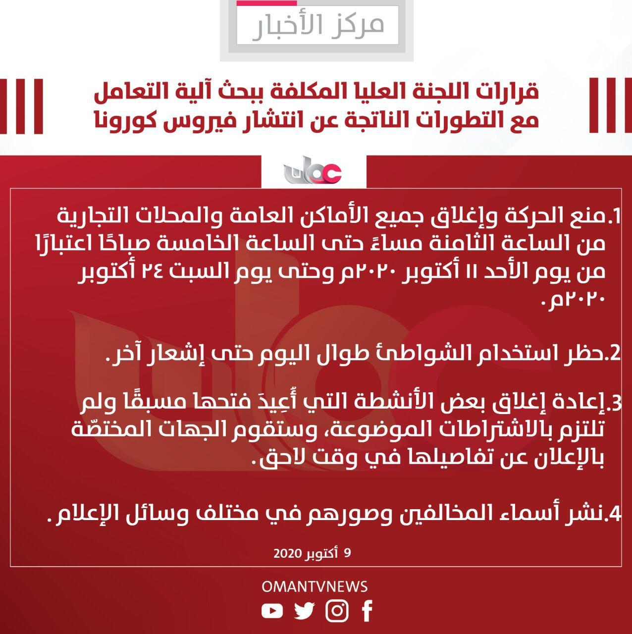 1- منع الحركة وإغلاق جميع الأماكن العامة والمحلات التجارية من الساعة (8:00) الثامنة مساءً حتى الساعة (5:00) الخامسة صباحًا اعتبارًا من يوم الأحد ١١ أكتوبر ٢٠٢٠م وحتى يوم السبت ٢٤ أكتوبر ٢٠٢٠م.
