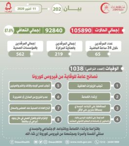 أعلنت وزارة الصحة بأن إجمالي عدد الإصابات المُسجلة بفيروس كورونا بالسلطنة 105890 إصابة والوفيات 1038 بنسبة 98ر0% والمتعافين 92840 لتصل نسبة الشفاء إلى 6ر87%.
