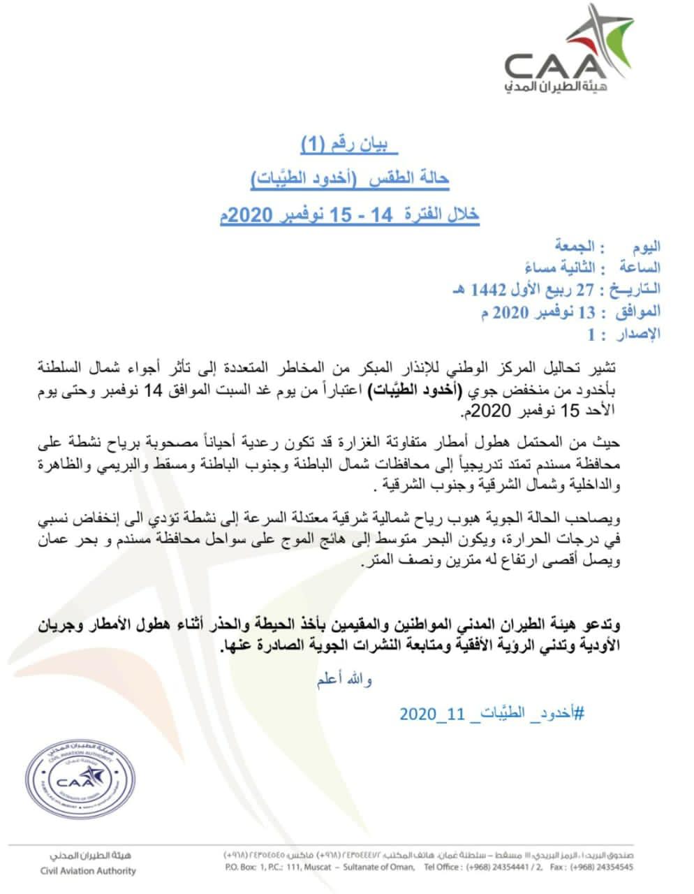 ومن المحتمل هطول أمطار متفاوتة الغزارة قد تكون رعدية أحيانا مصحوبة برياح نشطة على محافظة مسندم تمتدّ تدريجيّا إلى محافظات شمال الباطنة وجنوب الباطنة