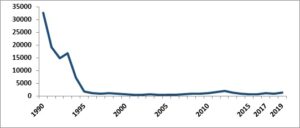 الشكل رقم (1): تطور أعداد المؤسسات الصحية التابعة لوزارة الصحة منذ عام 1990م حتى 2019م