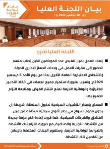 اللجنة العليا المكلفة ببحث آلية التعامل مع التطورات الناتجة عن انتشار فيروس كورونا (كوفيد۱۹) تقرر إنهاء العمل بقرار تقليص عدد الموظفين الذين يُطلب منهم الحضور إلى مقرات العمل في وحدات الجهاز الإداري للدولة والأشخاص الاعتبارية العامة الأخرى بدءًا من يوم الأحد القادم الموافق 6 ديسمبر.