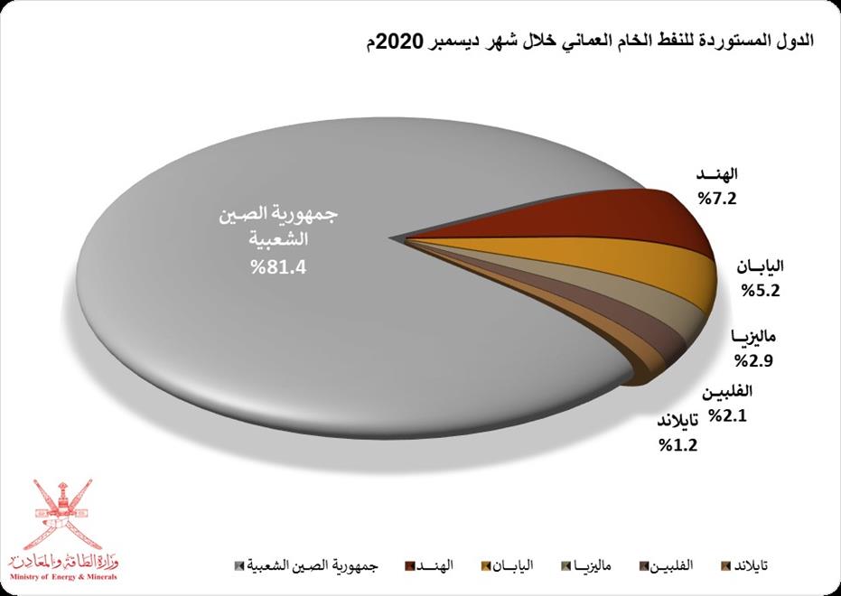 وشهدت واردات جمهورية الصين الشعبية ارتفاعًا في الطلب على الخام العُماني خلال شهر ديسمبر 2020م بمقدار 6 بالمائة لتسجل 81.4 بالمائة من مجمل الصادرات مقارنة مع كميات شهر نوفمبر 2020م.