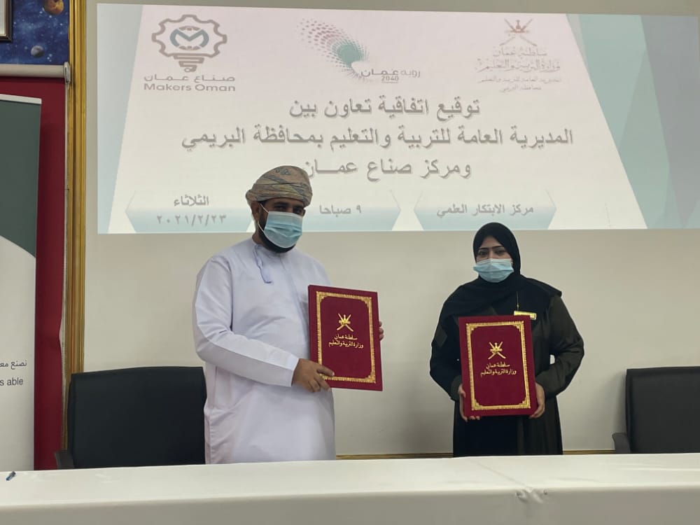 في إطار الجهود التي تبذلها المديرية العامة للتربية والتعليم بمحافظة البريمي لتعزيز مبدأ الشراكة مع المؤسسات الحكومية والخاصة والمؤسسات الأهلية، وسعياً لتطوير وإيمانا بضرورة التعاون المشترك فيما يتعلق بتطوير العملية التعليمية وتبادل الخبرات وتعزيز العلاقات المهنية، شهد مركز الابتكار العلمي بتعليمية البريمي توقيع اتفاقية التعاون بين المديرية العامة للتربية والتعليم بمحافظة البريمي ومركز صناع عُمان، وقع الاتفاقية من جانب المديرية الدكتورة فتحية بنت خلفان بن سليمان السدّية المديرة العامة، فيما وقعها من جانب المركز الفاضل هلال بن ناصر الشبلي مدير عام مركز صناع عُمان.