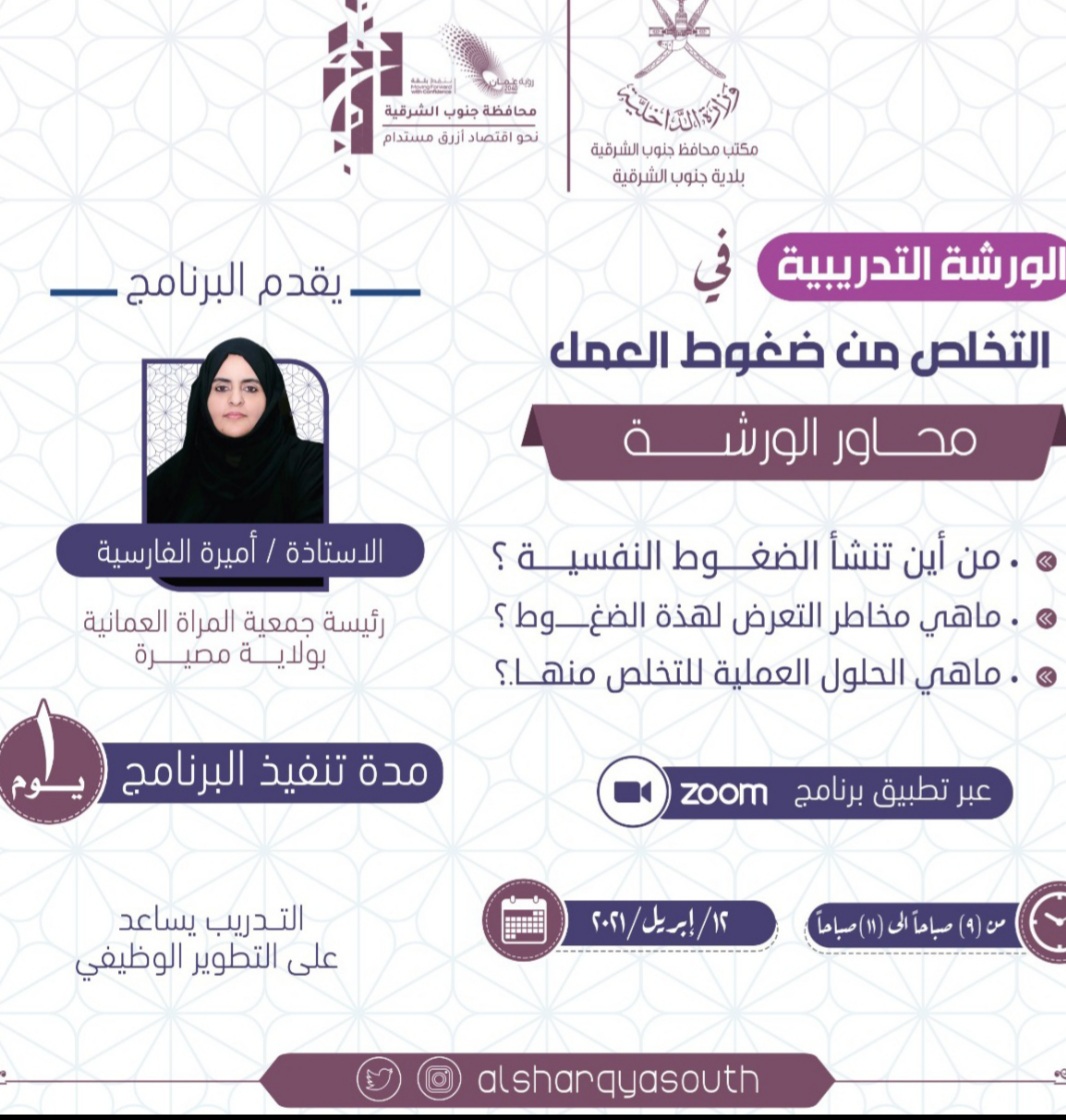 قدمت البرنامج أميرة الفارسية ـ رئيسة جمعية المرأة العمانية بولاية مصيرة ، وهدف البرنامج إلى التعريف بأهم الطرق والأساليب التي تساعد على التخلص من ضغوط العمل والتي بدورها تعزز الأداء الوظيفي والنجاح في العمل .