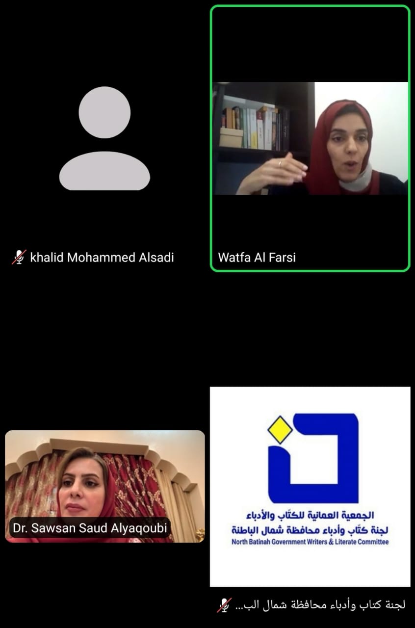 نظم فريق الدراسات والبحوث بلجنة كتاب وأدباء شمال الباطنة لقاء إلكترونيا بعنوان الدراسات العلمية ودورها في التحولات المجتمعية استضافت فيها الدكتورة سوسن بنت سعود اليعقوبية ضيفتها الأستاذة وطفة الفارسية باحثة إجتماعية.
