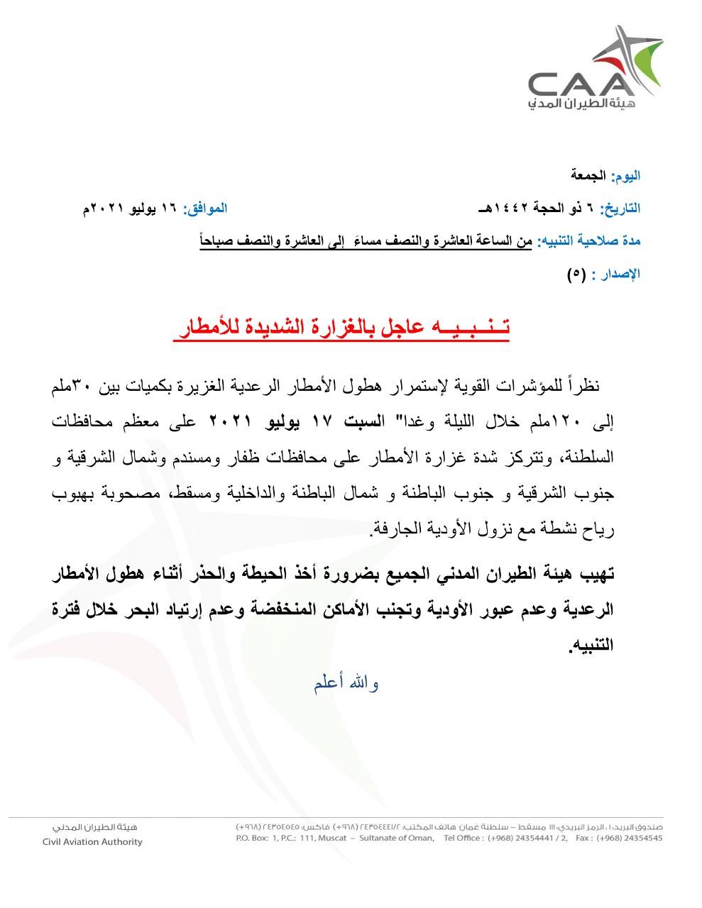 نظراً للمؤشرات القوية لإستمرار هطول الأمطار الرعدية الغزيرة بكميات بين ۳۰ ملم إلى ۱۲۰ ملم خلال الليلة وغدا “السبت ١٧ يوليو ۲۰۲۱م” على معظم محافظات السلطنة ، وتتركز شدة غزارة الأمطار على محافظات ظفار ومسندم وشمال الشرقية و جنوب الشرقية و جنوب الباطنة وشمال الباطنة والداخلية ومسقط ، مصحوبة بهبوب مع نزول الأودية الجارفة . ورياح نشطة . فإنَّ هيئة الطيران المدني تهيب الجميع بضرورة أخذ الحيطة والحذر أثناء هطول الأمطار الرعدية وعدم عبور الأودية وتجنب الأماكن المنخفضة وعدم إرتياد البحر خلال فترة التنبيه .