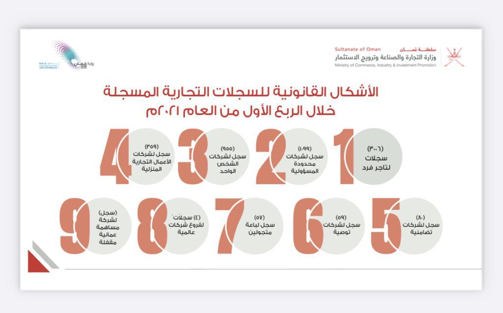 ووضحت دائرة الاحصاء بالوزارة أن السجلات التجارية المسجلة تمثلت في (3006) سجلات لتاجر فرد تم تسجيلها في الربع الأول من العام الحالي مقارنة بـ(2257) سجلاً تم تسجيلها في الربع الأول من2020م، وتسجيل (1099) سجلاً لشركات محدودة المسؤولية، مقارنة بـ(919) سجلا تم تسجيلها في الربع الأول من العام الماضي، و(955) سجلا لشركات الشخص الواحد تم تسجيلها في الربع الأول من2021م مقارنة بـ(666) سجلا مسجلة خلال نفس الفترة من العام الماضي، وتسجيل (359) سجلا لشركات للأعمال التجارية المنزلية مقارنة بـ (249) سجلا تم تسجيلها في الربع الأول من العام الماضي.