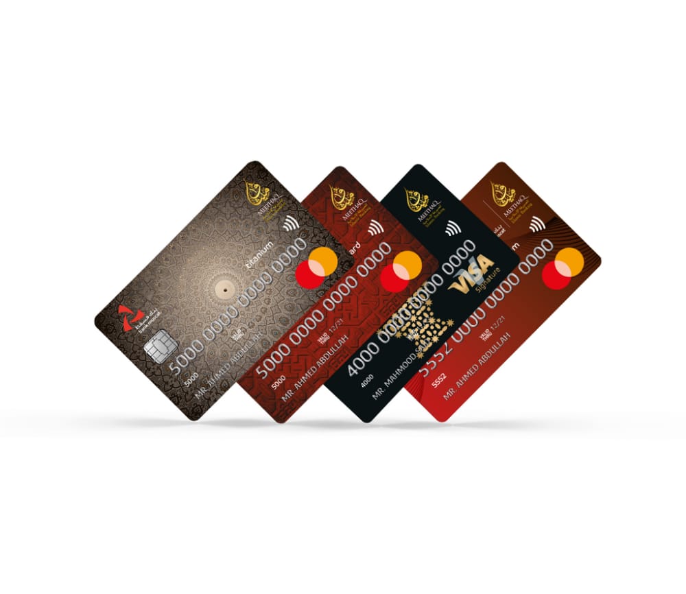 ترجمة لرؤية البنك “نعمل لخدمتكم بشكل أفضل كل يوم”، يقدم ميثاق للصيرفة الإسلامية من بنك مسقط مجموعة متنوعة من بطاقات الاِئتمان لزبائنه للاستفادة من المزايا العديدة والمنافع التي تقدمها، هذا ويعد ميثاق الرائد في الصيرفة الإسلامية في السلطنة حيث يعمل على مبدأ الشفافية، والثقة والشراكة مع الحرص على الالتزام بالقيم الإسلامية، ويواصل ميثاق تقديم الخدمات الجديدة المتعلقة بالبطاقات الاِئتمانية من خلال توفير 4 خيارات متنوعة لزبائنه متطابقة مع أحكام الشريعة الإسلامية ومن ضمن هذه البطاقات حفاوة فيزا سيجنيتشر الاِئتمانية وماستركارد تيتانيوم الاِئتمانية، وميثاق لولو الاِئتمانية وستاندرد ماستركارد الاِئتمانية، وما يميز هذه البطاقات أيضا أنه يحق للزبائن التقدم بطلب 5 بطاقات اِئتمانية إضافية لكل بطاقة من البطاقات المذكورة ليتمكن حاملي هذه البطاقات من التمتع بكافة المزايا التي تقدمها، بالإضافة لما سبق، يقدم ميثاق عرض إعفاء الرسوم السنوية على البطاقات الاِئتمانية والبطاقات الإضافية للسنة الأولى ولمدة محدودة للتعزيز التعاملات الإلكترونية ولتشجيع الزبائن وعوائلهم على الإستفادة من المزايا التي تقدمها هذه البطاقات.