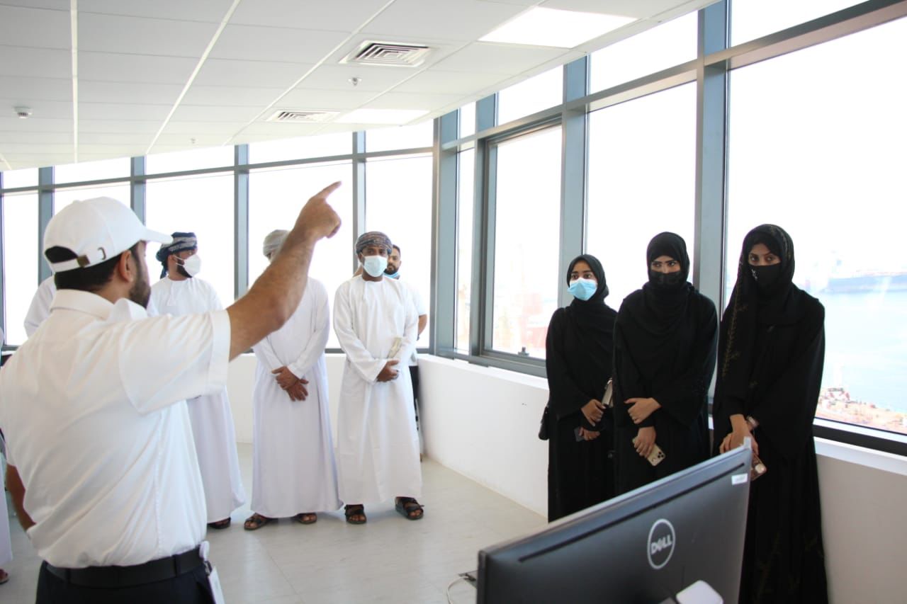 ومن ضمن برنامج الزيارة قام الطلبة المكرمين بزيارة لمرافق الميناء كبرج المراقبة البحرية حيث تعرفوا على عمل البرج في الميناء وشرح طرق تنظيم السفن وتفريغها على الرصيف التجاري ،بعدها قاموا بعمل جولة ميدانية في الميناء لمشاهدة سير العمل فيه وطرق السلامة والوقاية من المخاطر والتعرف على السفن العملاقة التي ترسو على رصيفه ومشاهدة طرق انزال وتفريغ الحاويات من السفن للرصيف التجاري بالميناء ،وقاموا بجولة بحرية تعريفية لما يحتويه ميناء الدقم ومشاهدة السفن الراسية على الرصيف التجارية والتعرف على طرق تنظيمها والعمل فيه .