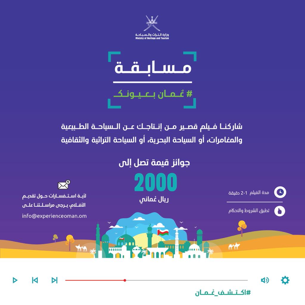 أعلنت وزارة التراث والسياحة ممثلة في المديرية العامة للترويج السياحي عن إطلاقها لمسابقة تختص بصناعة وإنتاج الأفلام الترويجية القصيرة تحت عنوان ( عمان بعيونك ) للترويج عن المقومات السياحية والتراثية التي تتميز بها السلطنة وتسليط الضوء على الأنماط الطبيعية التي تسهم في جذب واستقطاب المهتمين من مختلف الفئات والأسواق العالمية حيث تدعو الوزارة عبر مختلف قنواتها التفاعلية الهواة والمحترفين العمانيين في المشاركة بأعمالهم في هذا المجال الإبداعي .