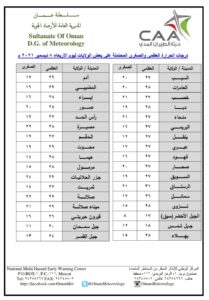 حالة الطقس : صـحـو إلـى غـانـم جزئيـا علـى المحافظـات الشـمالية وصـحو بوجـه عـام علـى بقيـة المحافظـات بسـلطنة عمـان مـع إحتمـال تشـكـل السـحب المنخفضـة أو الضـباب آخـر الليـل والصـباح البـاء علـى اجـزاء مـن محافظـات الظـاهرة وجنـوب الشـرقية والوسطی وسواحل بحر العرب .