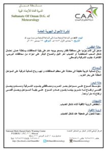 حالة الطقس : صحو إلى غائم جزئيا على محافظة ظفار وصحو بوجه عام على بقية المحافظات بسلطنة عمان . واحتمال تشكل السحب المنخفضة أو الضباب آخر الليل والصباح الباكر على أجزاء من محافظات البريمي ، الظاهرة ، جنوب الشرقية والوسطى .