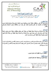 الريـاح : تهب رياح شرقية إلى شمالية شرقية خفيفة إلى معتدلة على معظم محافظات سلطنة عمان وتكون نشطة أحياناً على سواحل بحر العرب بينما تهب رياح شرقية إلى شمالية شرقية خفيفة إلى معتدلة خلال النهار تتحول جنوبية شرقية خفيفة على سواحل بحر عمان .