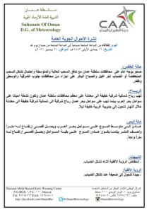 حالة الطقس : صحو بوجه عام على محافظات سلطنة عمان مع تدفق السحب العالية والمتوسطة وإحتمال تشكل السحب المنخفضة أو الضباب آخر الليل والصباح الباكر على أجزاء من محافظات جنوب الشرقية والوسطى وظفار.