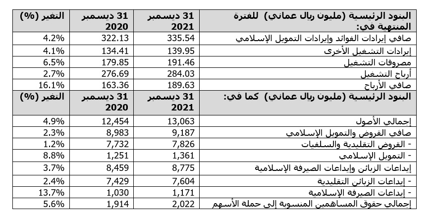 بلغ صافـي إيـرادات الفـوائد من الأعمال المصرفية التقليدية وإيرادات التمويل الإسلامي (335.54) مليون ريال عماني للسنة المنتهية في 31 ديسمبر 2021م مقارنةً بمبلغ (322.13) مليون ريال عماني للفترة ذاتها من العام 2020م، أي بزيادة نسبتها (%4.2).