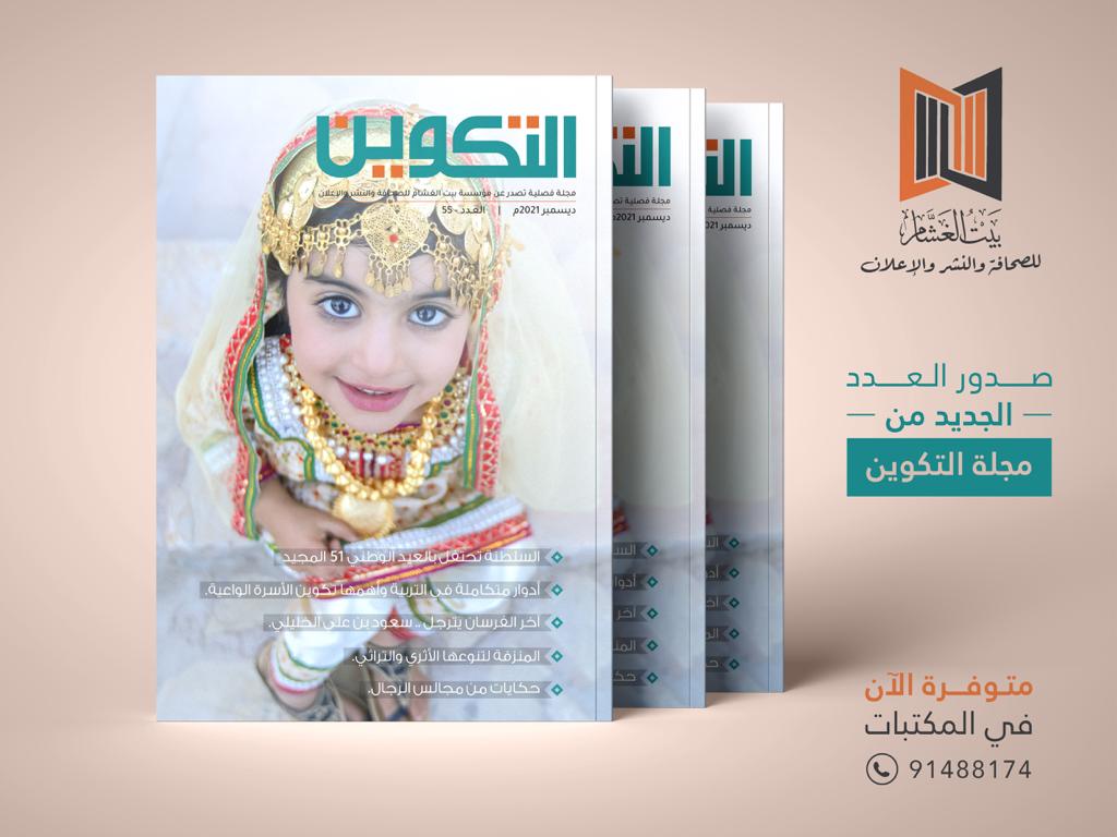 صدر العدد الجديد رقم 55 من مجلة التكوين التي تصدر عن مؤسسة بيت الغشام للصحافة والنشر والاعلان متضمنا العديد من المواضيع والمقالات المتنوعة.