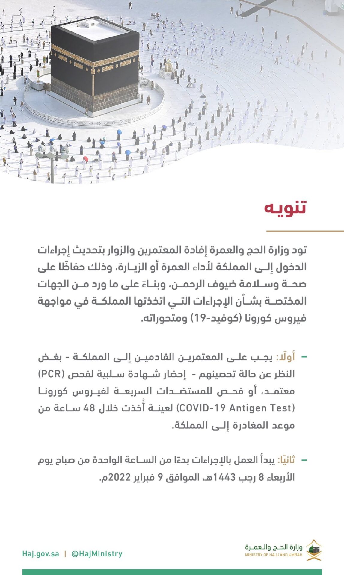 ذكرت وزارة الحج والعمرة في المملكة العربية السعودية في حسابها على تويتر عن تحديث إجراءات دخول المعتمرين والزوار إلى المملكة لأداء مناسك العمرة أو الزيارة، بوجوب إحضار شهادة سلبية معتمدة لفحص (PCR) لفيروس كورونا لعينة أخذت خلال 48 ساعة من موعد المغادرة إلى المملكة بدءا من بعد غد الأربعاء.