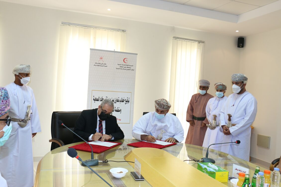 ومن هذا المنطلق تم توقيع خطاب تعاون بين مدينة بركاء الصحية ومنظمة الصحة العالمية حيث مثل مدينة بركاء الصحية في توقيع الاتفاقية سعادة الشيخ/ عبدالله بن محمد البريكي والي ولاية بركاء رئيس اللجنة الصحية ومن جانب منظمة الصحة العالمية سعادة الدكتور/ جون جبور ممثل منظمة الصحة العالمية بسلطنة عمان.