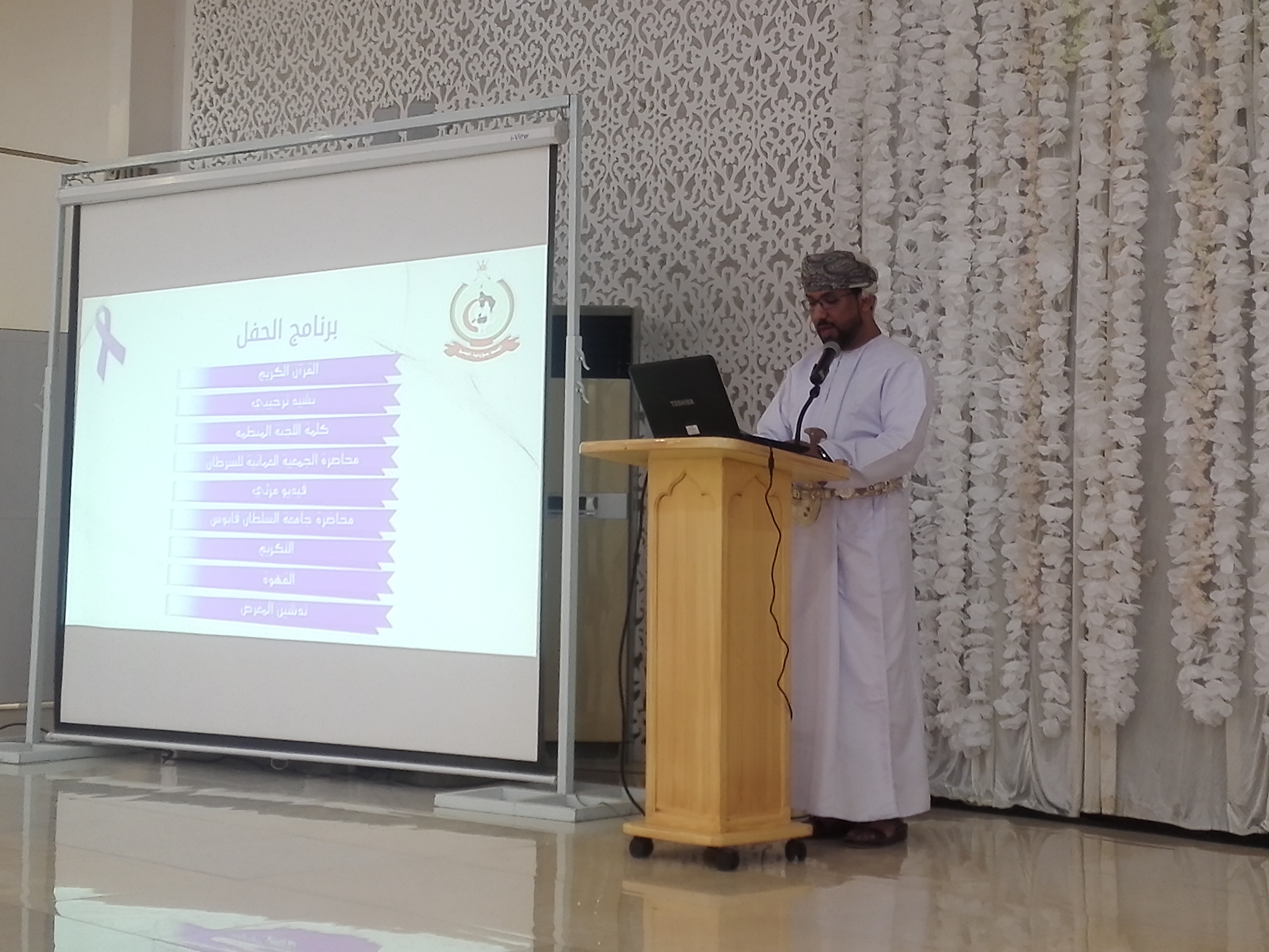 بعدها تم إلقاء محاضره من جمعية السرطان عن أنشطة وأهداف الجمعية وماتقدمه من خدمات جليلة للمجتمع ، بعد ذلك تم عرض فيديو تحفيزي لبعث الأمل والطمأنينة لمرضى السرطان ، بعد ذلك تم إلقاء محاضرة من قسم التغذية بجامعة السلطان قابوس عن أهمية الغذاء في الوقاية من مرض السرطان وفي ختام الندوة كرم سعادة الشيخ راعي الندوة المنظمين والمشاركين وشكرهم على جهودهم المبذولة
