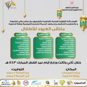 وتأتي إقامة مثل هذه الفعالية ضمن الخدمات التي تقدمها الدائرة لنشر البهجة والسعادة على وجوه أبنائنا الأطفال خلال هذه الفترة، حيث سيقيم المختصون بدائرة الشؤون البلدية بالخابورة وبالتعاون والتنظيم مع معهد الرحمة لتعليم الفروسية بولاية الخابورة (ملتقى العيّود للأطفال) في ثاني وثالث ورابع أيام عيد الفطر المبارك. وسوف يتخلل الملتقى إقامة المسابقات الثقافية وعمل معرض مصغر للأسر المنتجة بالولاية والعديد من الفعاليات الأخرى كركوب الخيل وركوب الدرجات الهوائية واستضافة بعض الشخصيات الكرتونية المحببة لدى الأطفال وأيضًا إقامة فعاليات من قبل المهرجين وألعاب الخفة، كما ستقوم بعض الفرق الإنشادية بالمشاركة بالملتقى، وفي ثالث أيام العيد ستقام مسرحية (عور شور)، وفي رابع أيام العيد ستكون فقرة للفنانة نورة النظيري التي دائمًا ما تكون قريبة جدًّا من الأطفال بأسلوبها الشيق المحبب لهم، كما ستكون هناك ردهة للمأكولات والمطاعم.