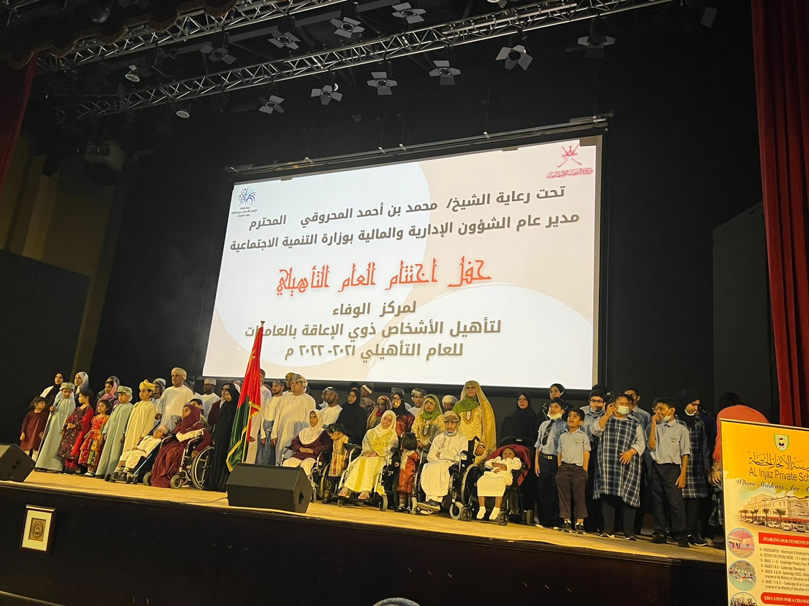 تحت رعاية الشيخ محمد بن أحمد المحروقي مدير عام الشؤون الإدارية والمالية بوزارة التنمية الاجتماعية، اختتم مركز الوفاء لتأهيل الأشخاص ذوي الإعاقة بالعامرات عامه التأهيلي 2021/2022 بمسرح التربية التعليم بالوطية.