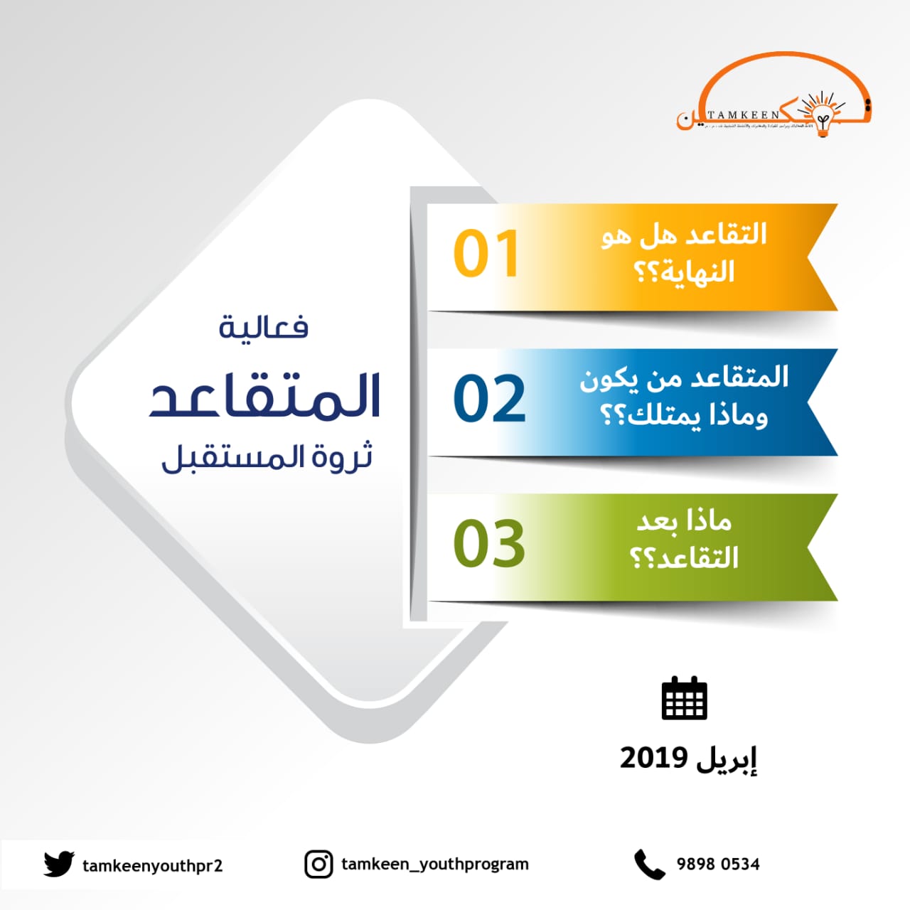 قامت شركة تمكين لإقامة الفعاليات وبرامج القيادة والمغامرات والأنشطة الشبابية بإطلاق مبادرتها الإجتماعية لعام 2019 فعالية ” المتقاعد ثروة المستقبل” والتي تستهدف المتقاعدين أو من هم على وشك التقاعد.