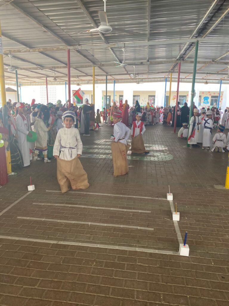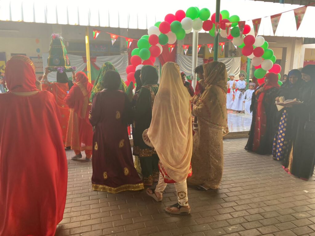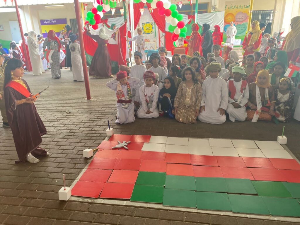 حيث شهدت ساحة الطابور بالمدرسة برنامجا إذاعيا بعنوان (عمان قصة فخر )بدأ البرنامج بتلاوة القرآن الكريم بعده فقرة استعراض للصف الأول ، تلا ذلك انشاد وطني ، ليستمتع الحضور بعدها ، بأهازيج الماضي العريق نسمعها ونشاهدها ، ولان التراث البحري وتاريخ عمان البحري شاهد على عراقة هذا الوطن الغالي تم تقديم فقرة العرض البحري يتبعه لعبة شعبية تعيدنا لأيام الماضي ثم فقرة أهازيج شعبية ينتهي مع الاستعراض الرياضي وقد تخلل هذه العروض فقرات عدة منها فن الربوبية ومسابقة ألوان العلم وفن البعرة كما شارك مجلس الأمهات بفقرة مميزة أحيت النشاط في أرجاء واحة العلم الغناء بأهازيج العرس العماني وختم الحفل بلوحة استعراضية شُكِّلَ فيها علم الوطن الغالي بألواح الفلين أضيئت حوله الشموع جعل الله أيام عمان مليئة بالفرح والسرور وحفظها أبية آمنة.