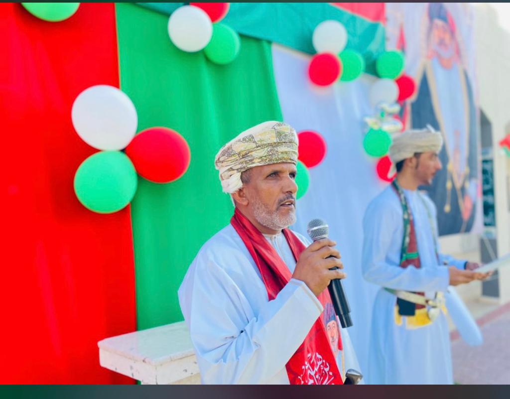 رفع فيها أسمى أيات التهاني والتبريكات للمقام السامي جلالة السلطان هيثم بن طارق ال سعيد سلطان عمان حفظه الله ورعاه والشعب العماني والأمة الاسلامية والعربية بمناسبة العيد الوطني العماني ٥٢ والى كافة المعلمين والمعلمات وهيئة التدريس كافة، وأولياء الأمور.