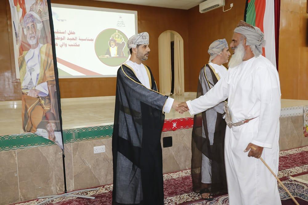 نظم مكتب والي هيماء حفل استقبال المهنئين بمناسبة العيد الوطني الثاني والخمسين المجيد حيث استقبل سعادة سليمان بن سالم بن سيف المحروقي والي هيماء بمعية الشيخ سعيد بن حمد المنجي نائب الوالي المهنئين من مسؤولي المؤسسات الحكومية المدنية والعسكرية بمحافظة الوسطى وأعضاء المجالس واللجان والمشايخ والرشداء وعدد من المواطنين والمقيمين بولاية هيماء.
